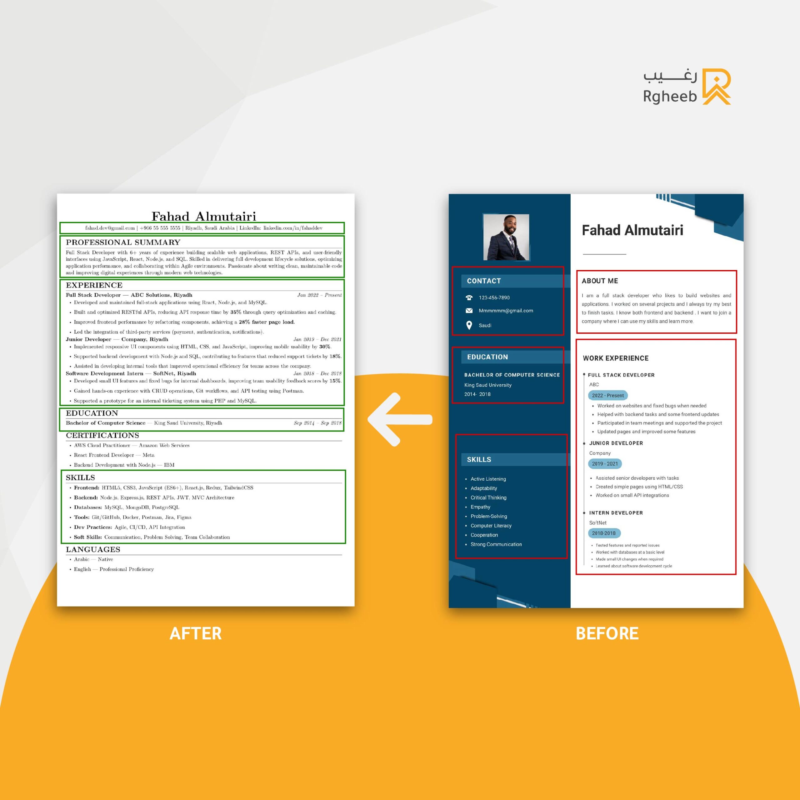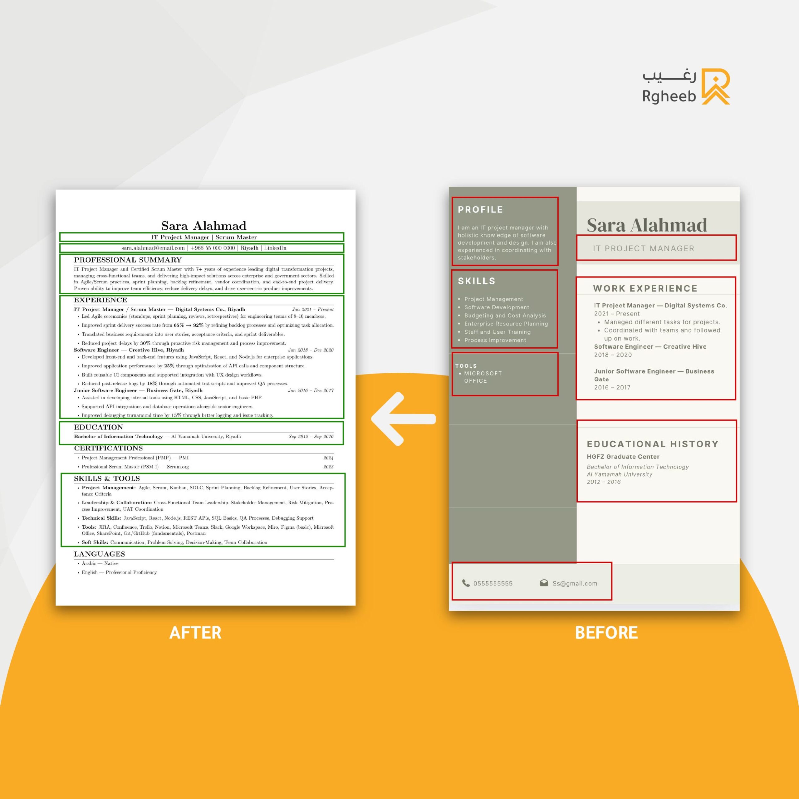 يعمل رغيب على إعادة صياغة السيرة الذاتية من منظور الجهة المعنية بالتوظيف، وبما يتوافق مع اللغة والمتطلبات التي يفرضها سوق العمل.